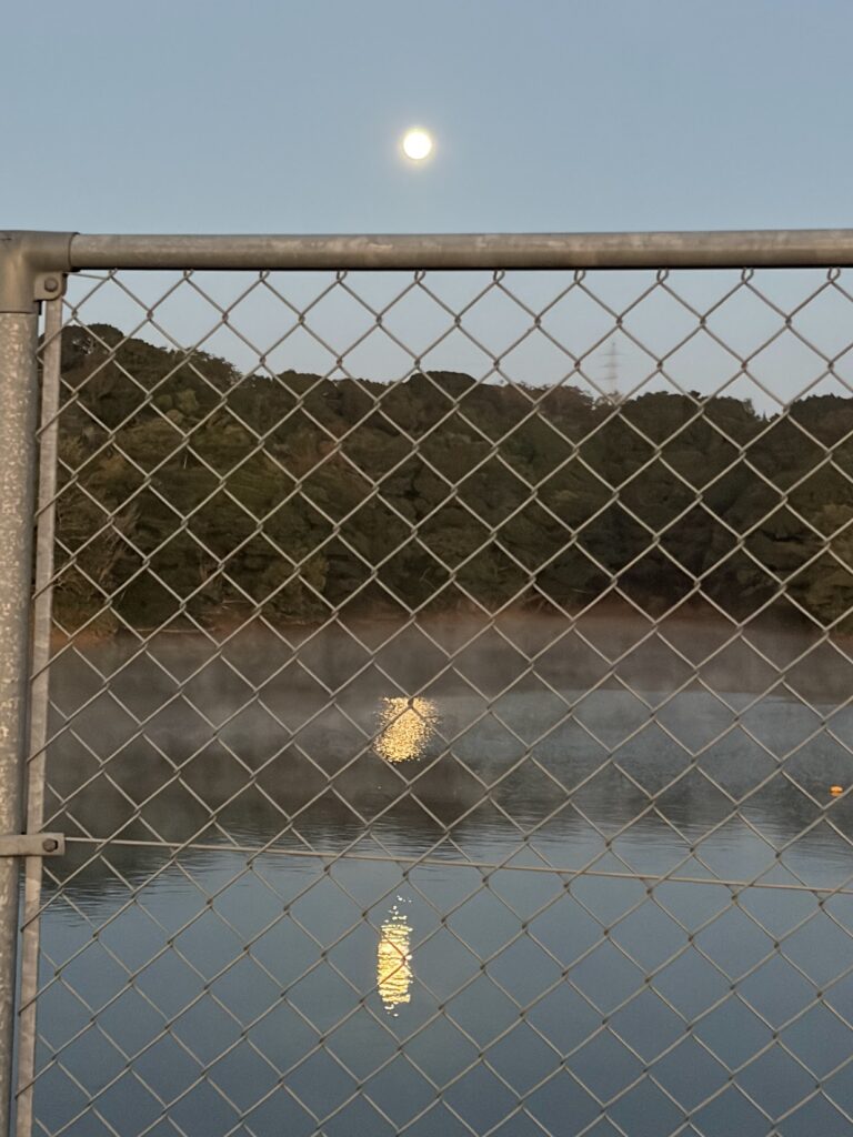 通勤路に浮かぶ月とそれが湖畔に映っています。